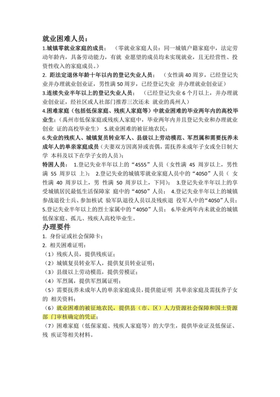 具有禹州市戶籍,在法定勞動年齡內,有勞動能力及就業愿望,進行失業登記的各類就業困難人員。具體包括以下人員:(零就業家庭人員:同一城鎮戶籍家庭中,法定勞動年齡內,具備勞動能力,有就業愿望的成員均未實現就業,且無經營性、投資性收入的家庭成員)(女性滿40周歲,已經登記失業并辦理就業創業證,男性滿50周歲,已經登記失業并辦理就業創業證)(已經通過河南省就業創業信息系統登記失業6個月以上,并辦理就業創業證,經社區或人社部門推薦三次還未就業的禹州人)4、困難家庭(包括低保家庭、殘疾人家庭等)中就業困難的畢業兩年內的高校畢業生;(禹州市低保家庭或殘疾人家庭中,畢業兩年內并且登記失業和辦理就業創業證的高校畢業生)5、失業的殘疾人、城鎮復員轉業軍人、縣級以上勞動模范、軍烈屬和需要撫養未成年人的單親家庭成員;(夫妻雙方因離異或喪偶,需撫養未成年子女或全日制大學本科及以下在學子女的人員)2、自愿從事公益性崗位,熱愛基層服務工作,吃苦耐勞,樂于奉獻。